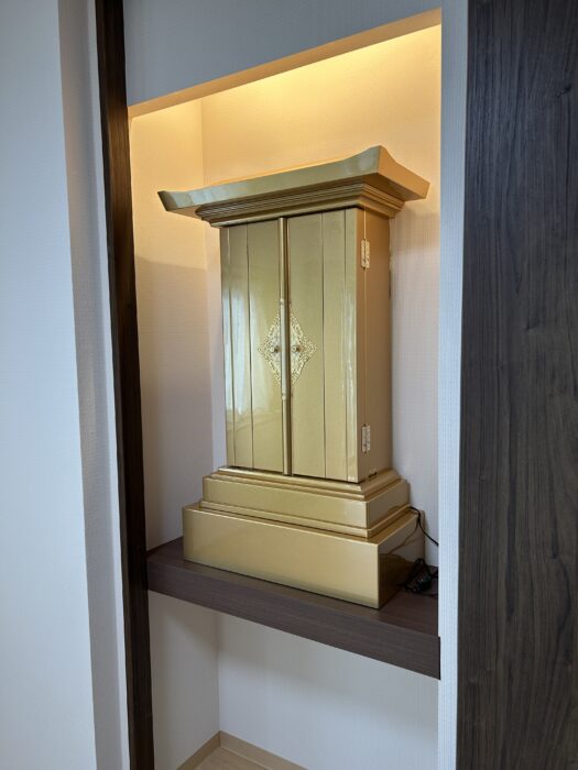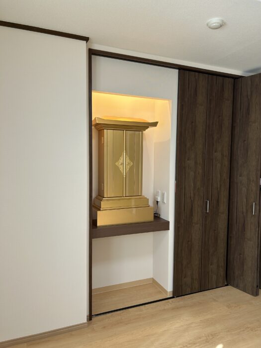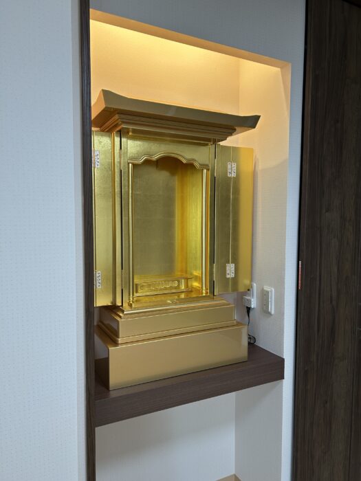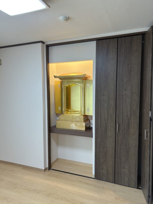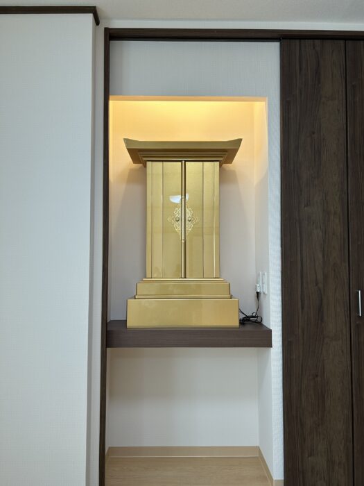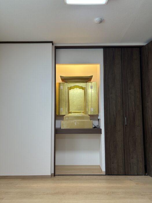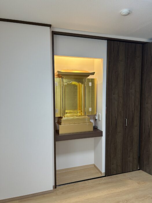 ■ インテリアに溶け込む、計算された設置 設置場所は、お部屋のクローゼット横に設けられた専用のスペース。 白を基調とした明るい壁紙と、ダークブラウンの建具という現代的な空間に、お仏壇の黄金色が鮮やかに映え、お部屋全体に凛とした格式高い雰囲気をもたらしてくれています。