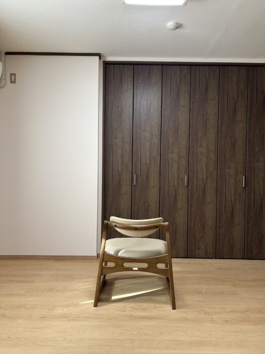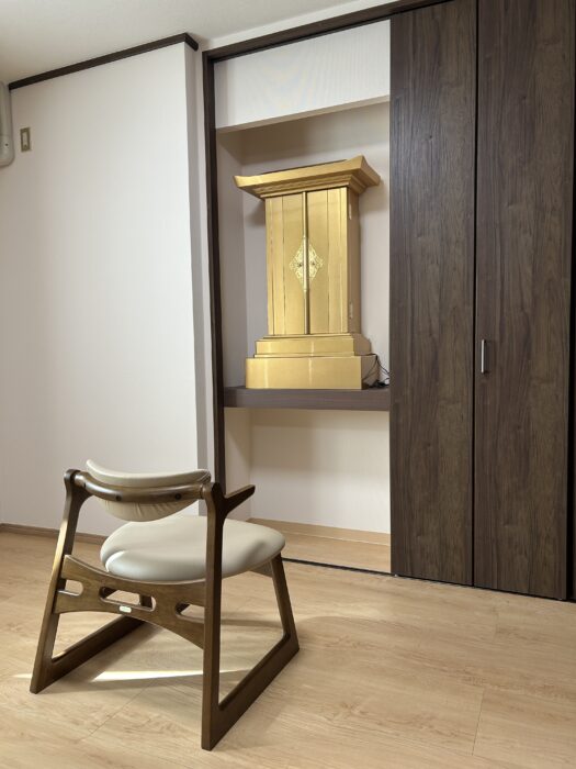 ■ 毎日の勤行を、お気に入りの椅子と共に お仏壇の前には、お客様こだわりのモダンなデザインの椅子を配置。 限られたスペースを最大限に活かしつつ、ゆったりと腰掛けてご本尊様と向き合える、理想的な「祈りの場所」が完成いたしました。