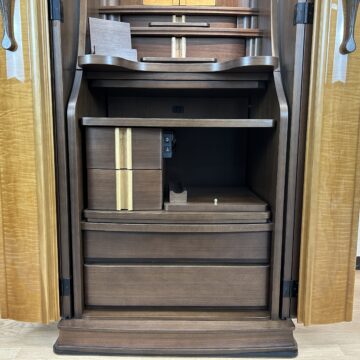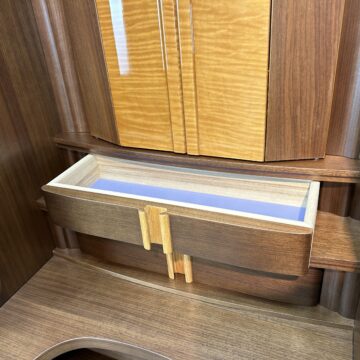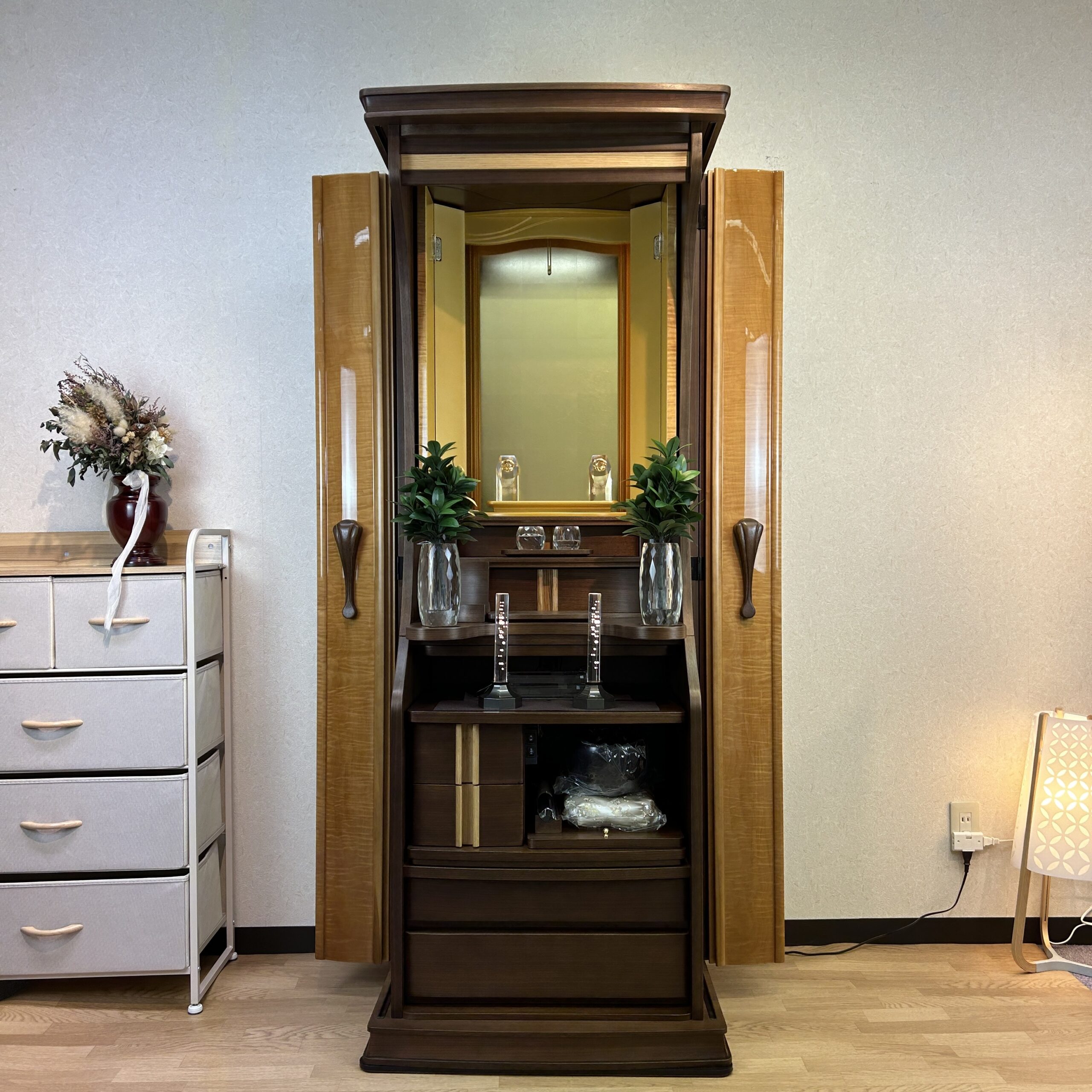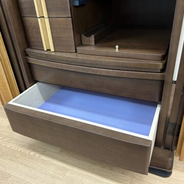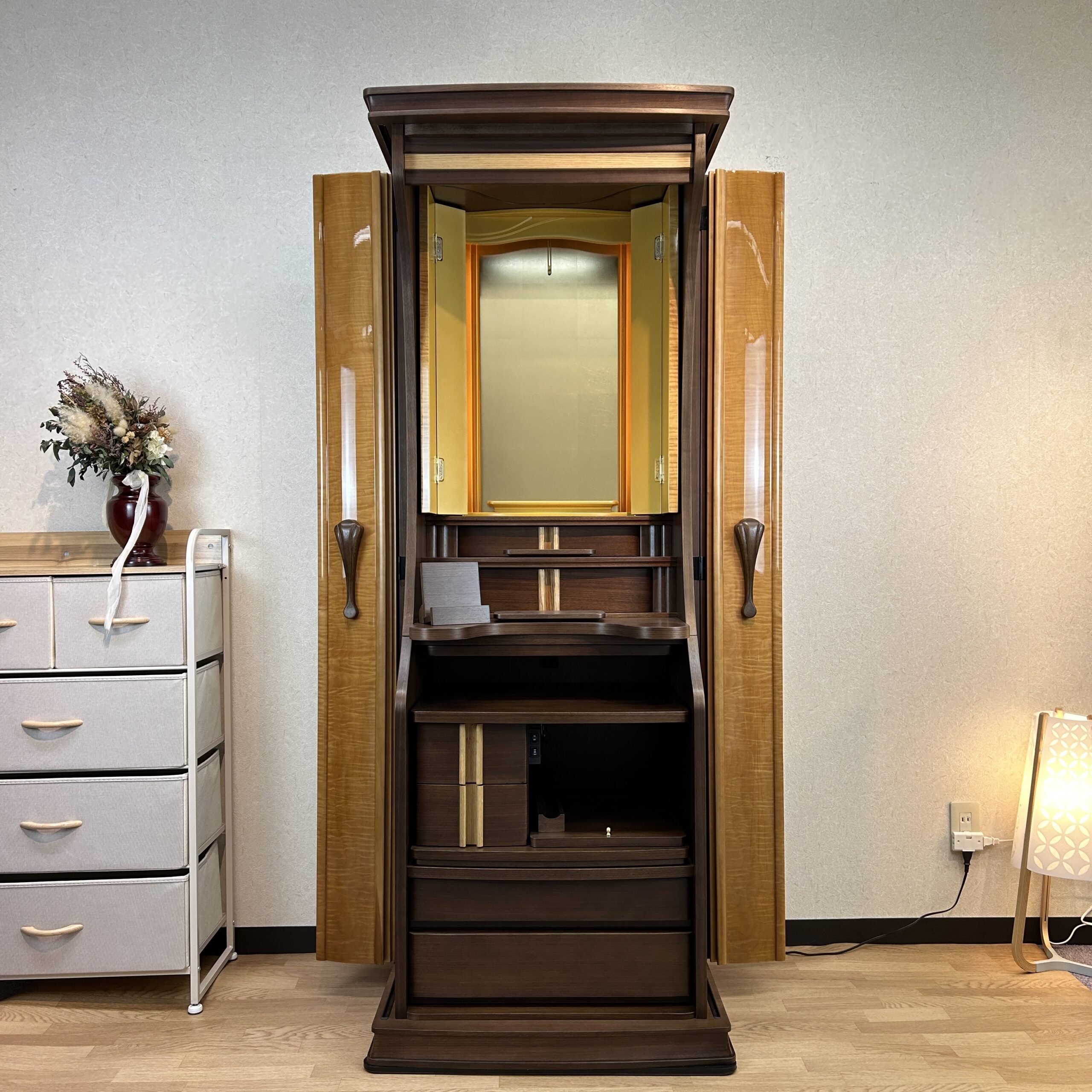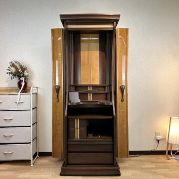 メープル材を用いたお仏壇は、美しいクリーム色からピンク色までの色合いと緻密な木目が特徴的です。伝統的なデザインや上品なスタイルが採用され、寸法や配置にも注意が払われています。祈りのスペースと収納スペースが組み合わさり、高品質な仕上げと耐久性が備わっています。その自然な美しさと機能性から、長く愛用されています