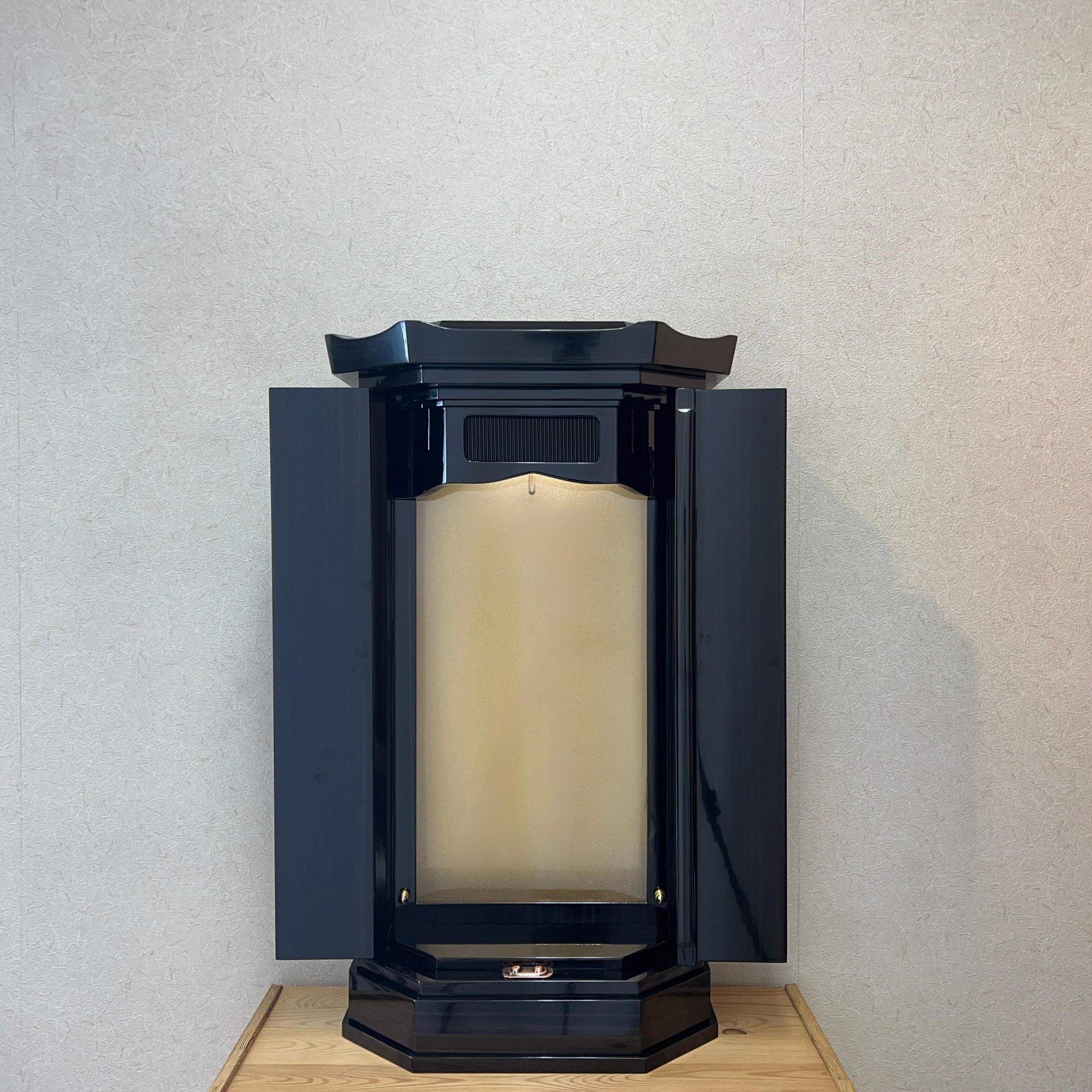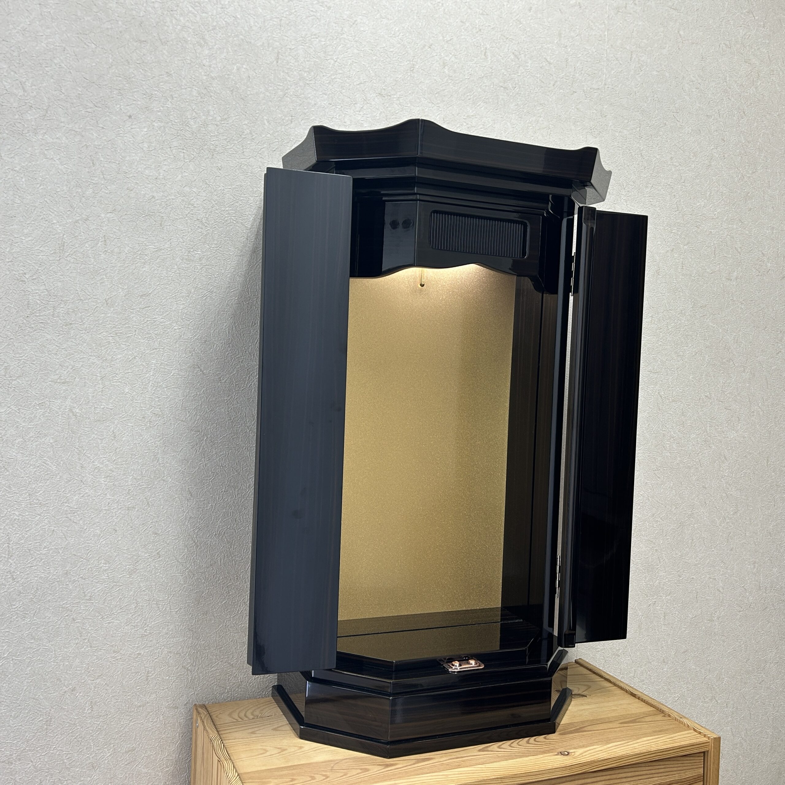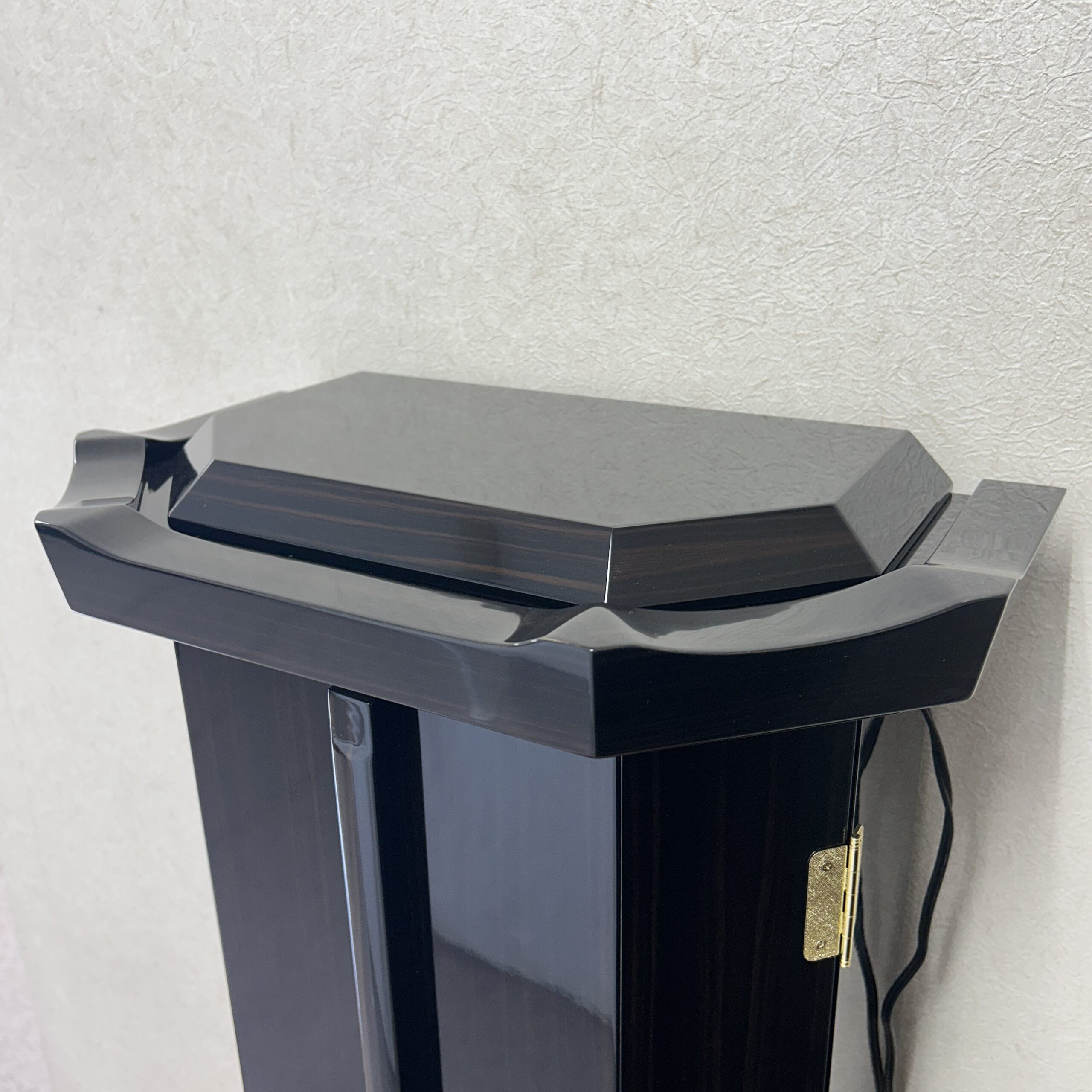【現代の暮らしに調和する、洗練された厨子型仏壇】 落ち着いた黒檀調の風合いが美しい、モダンな佇まいの厨子仏壇です。 扉には安全性と軽やかさを兼ね備えたアクリル素材を使用し、内部はやさしいLEDの灯りでご本尊を静かに照らします。 シンプルながらも上品なデザインは、和室にも洋室にも自然に馴染み、祈りの空間をさりげなく引き立てます。 伝統と現代の感性を融合させたこの一品が、ご家庭に素敵な祈りの時間をもたらします。