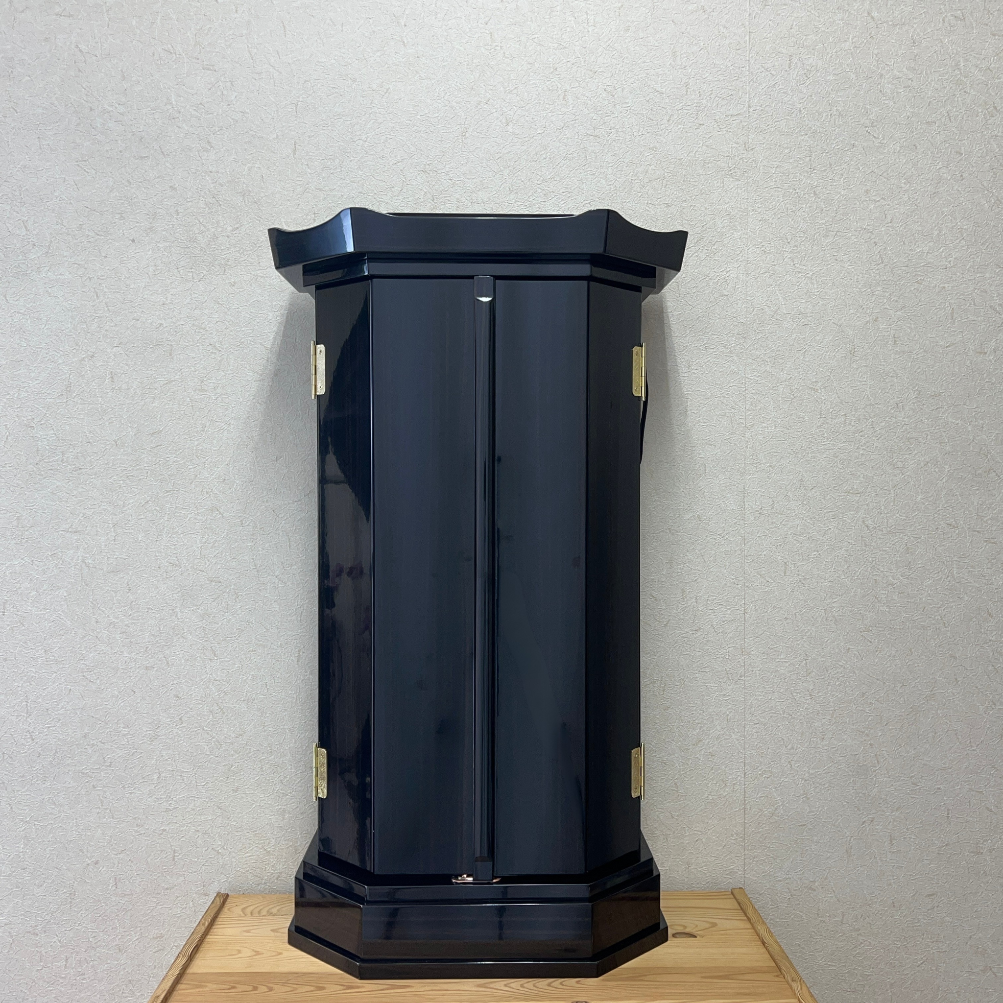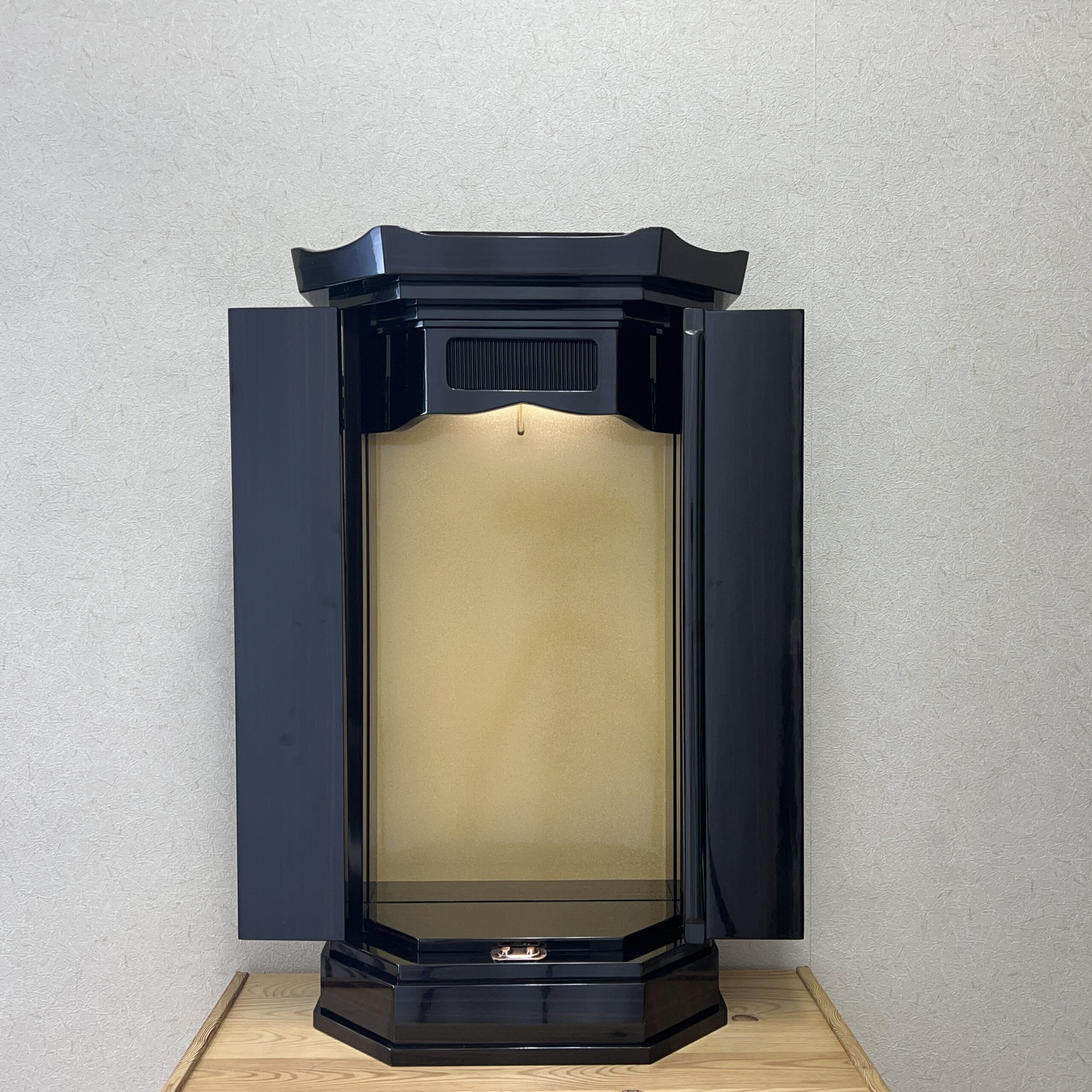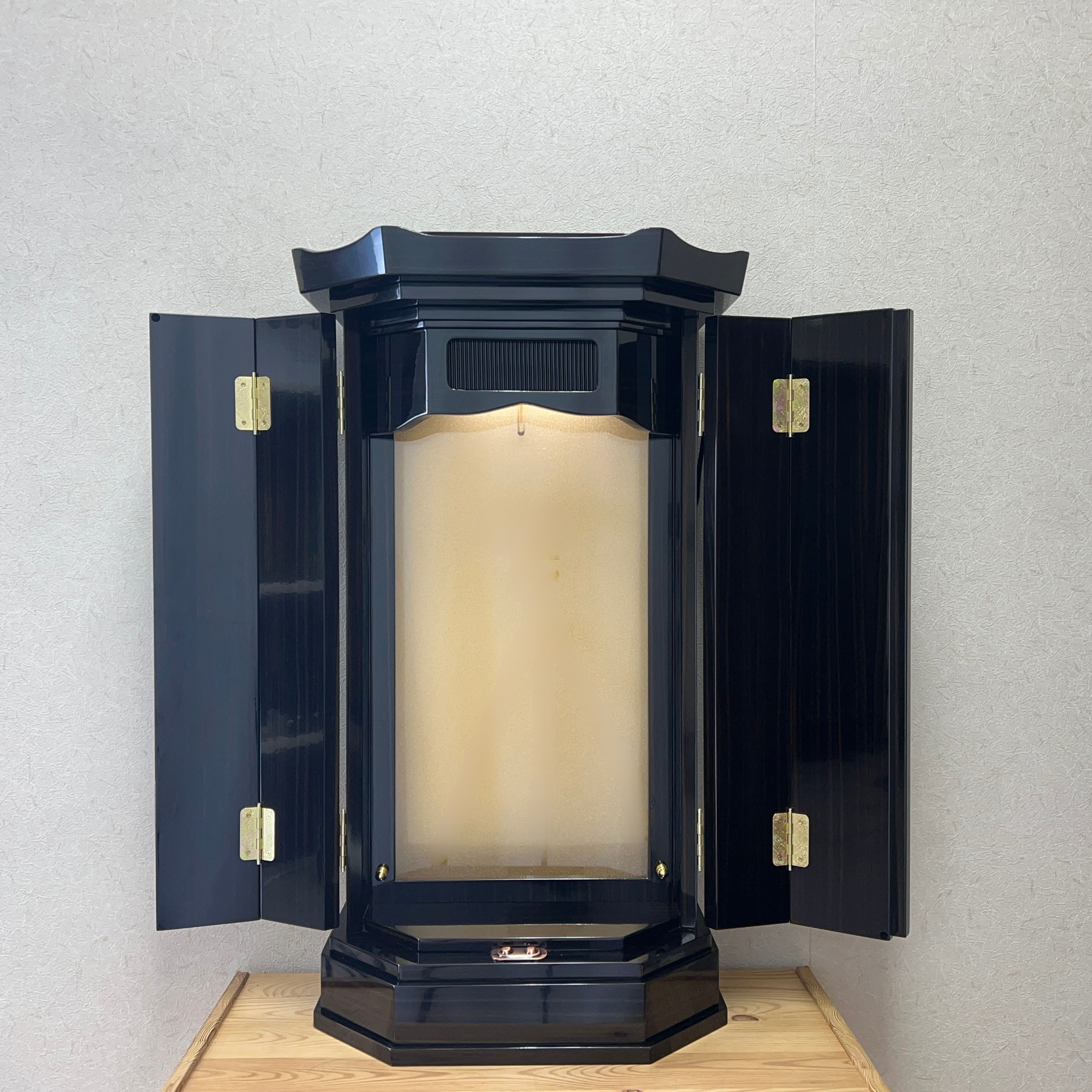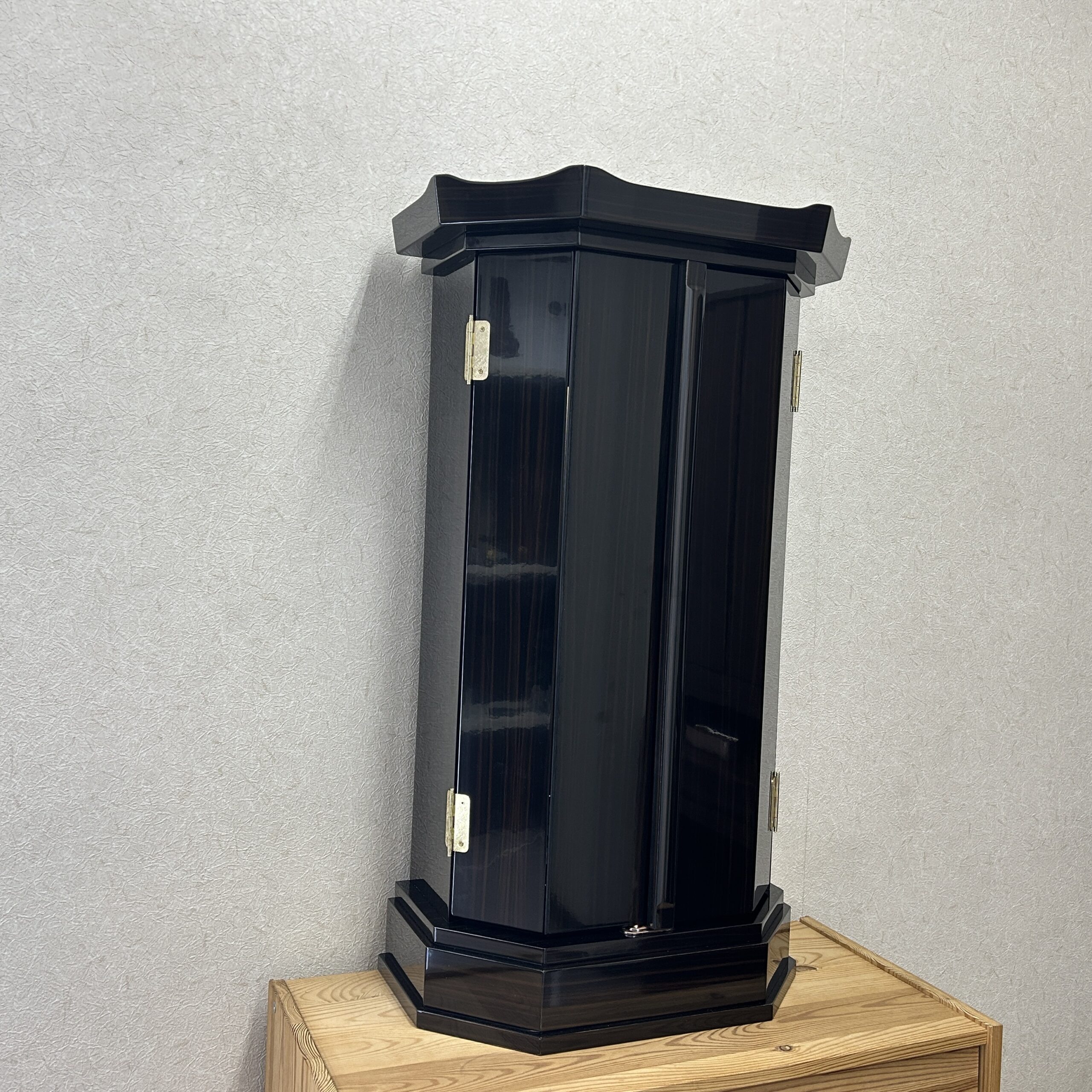 【現代の暮らしに調和する、洗練された厨子型仏壇】 落ち着いた黒檀調の風合いが美しい、モダンな佇まいの厨子仏壇です。 扉には安全性と軽やかさを兼ね備えたアクリル素材を使用し、内部はやさしいLEDの灯りでご本尊を静かに照らします。 シンプルながらも上品なデザインは、和室にも洋室にも自然に馴染み、祈りの空間をさりげなく引き立てます。 伝統と現代の感性を融合させたこの一品が、ご家庭に素敵な祈りの時間をもたらします。