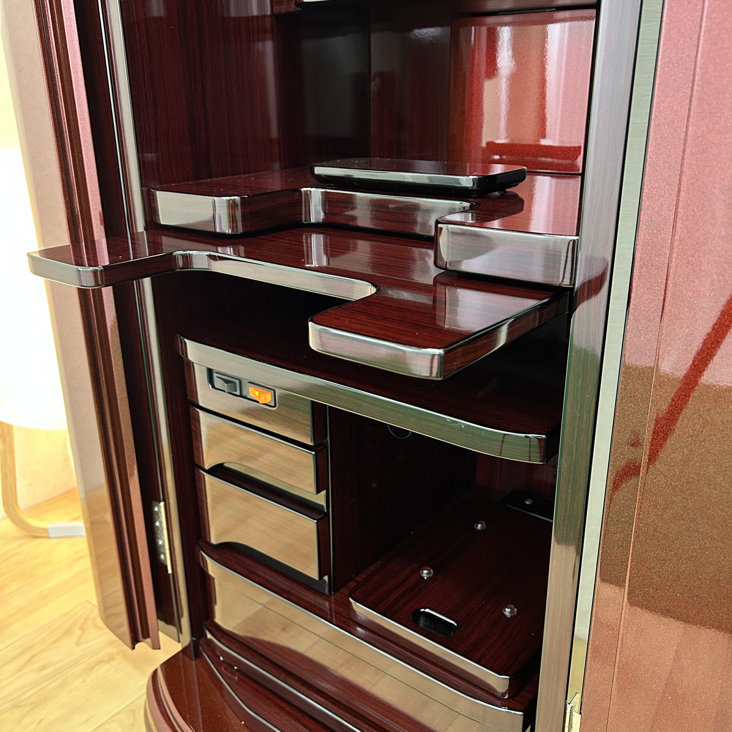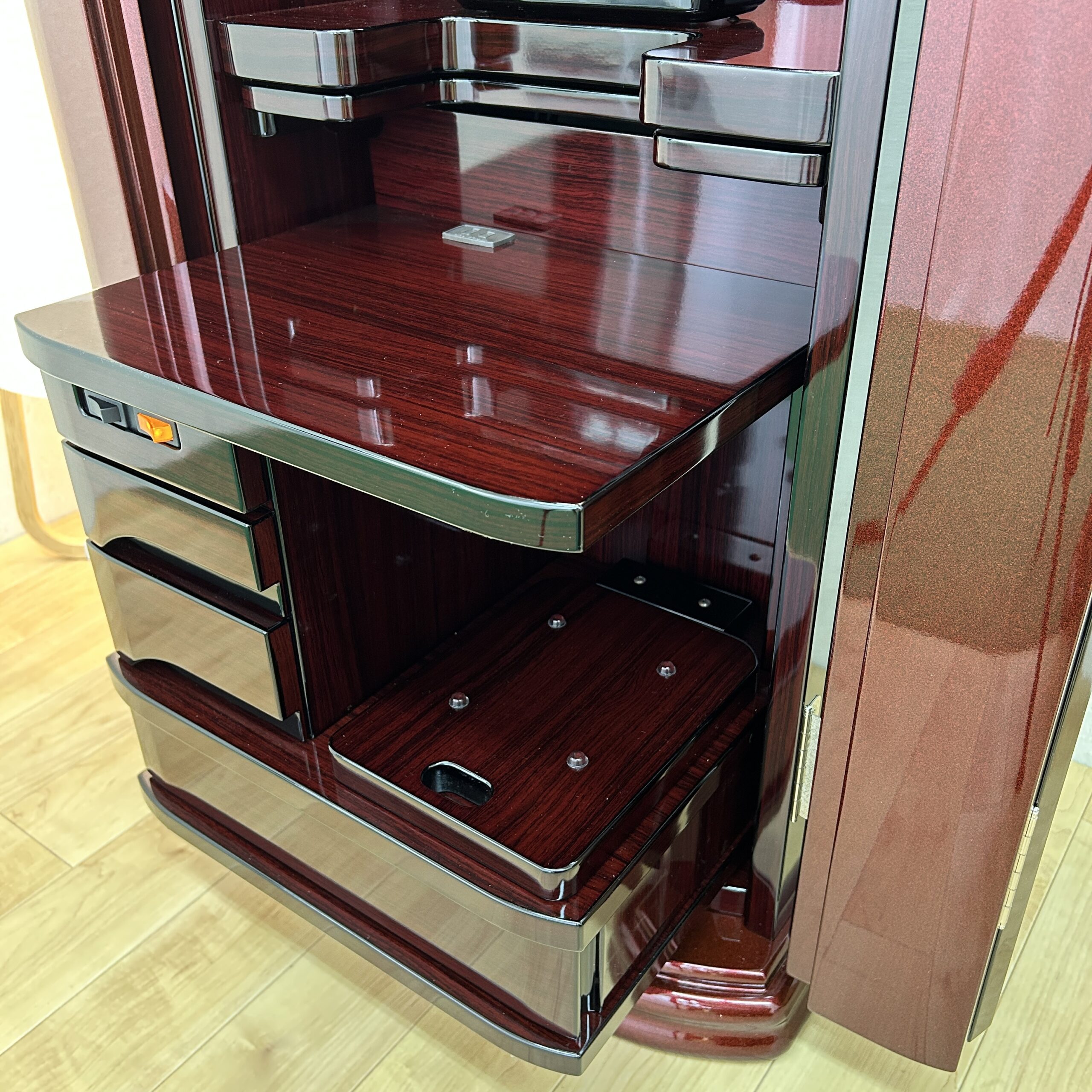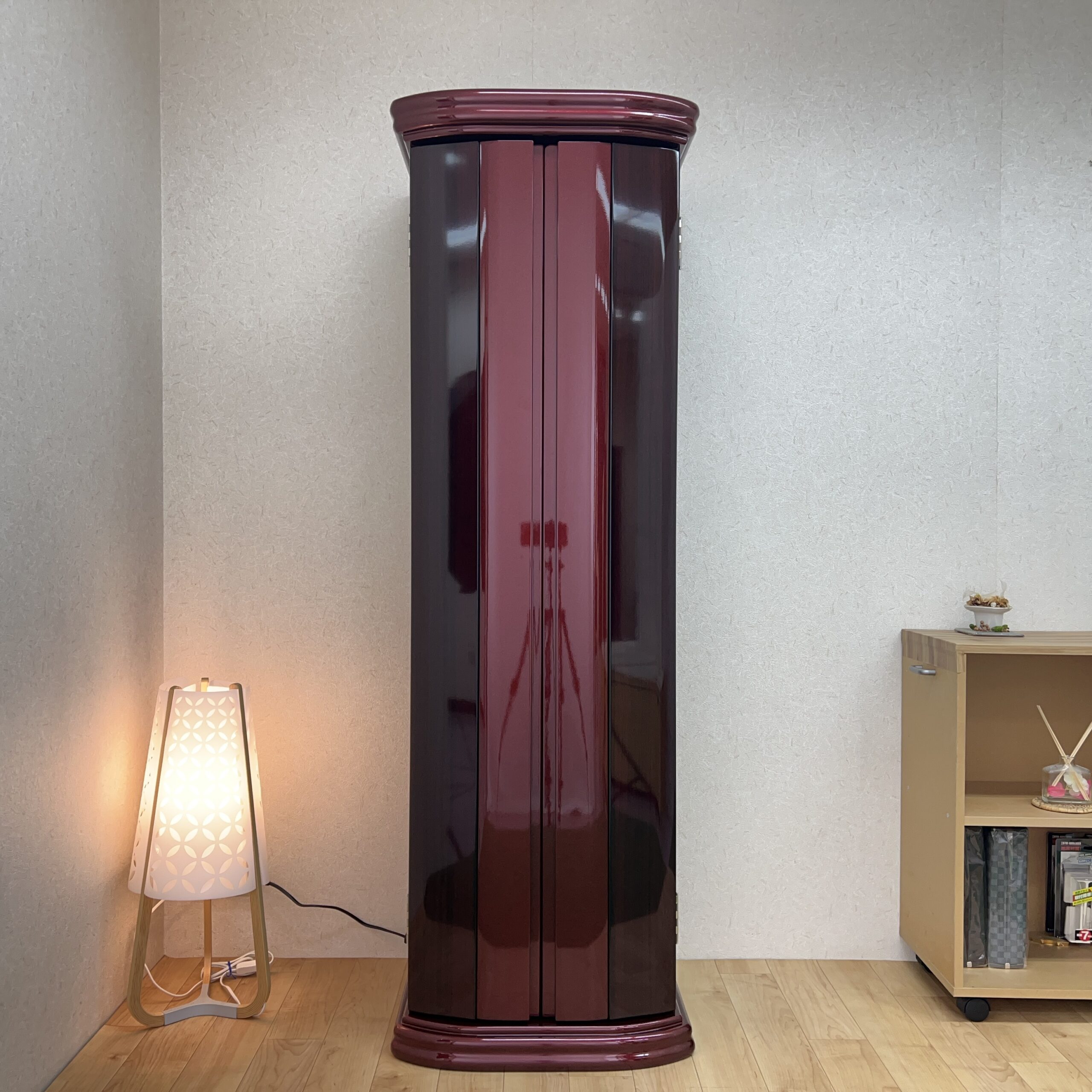 極上の美しさ「ワインレッド・メタリック仕上げ」 幾重にも塗り重ねられた多層塗りの光沢が、鏡のような透明感を生み出しています。角のないラウンドデザインが、重厚感の中にモダンな軽やかさをプラス。洋室・和室を問わず、どんなインテリアにも美しく調和します。