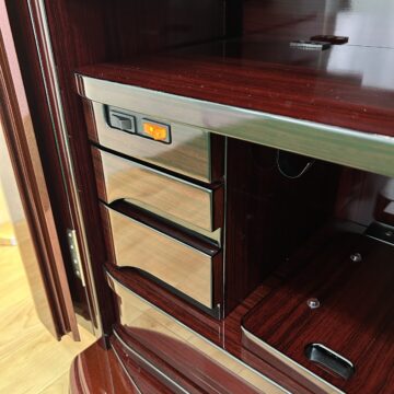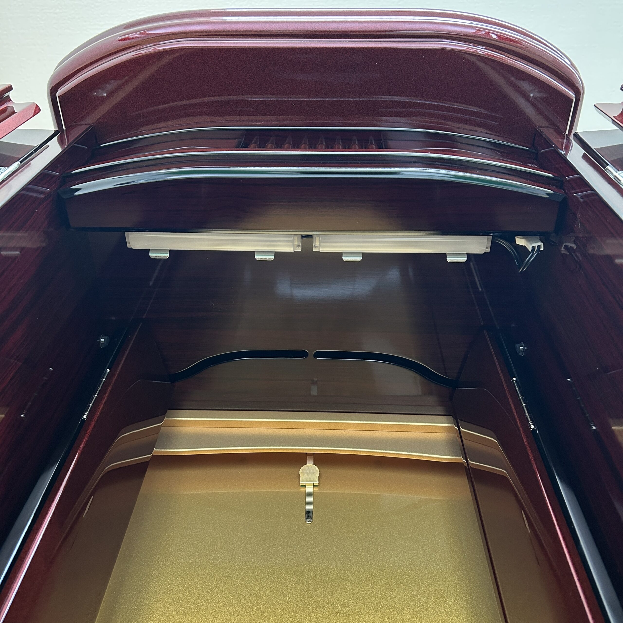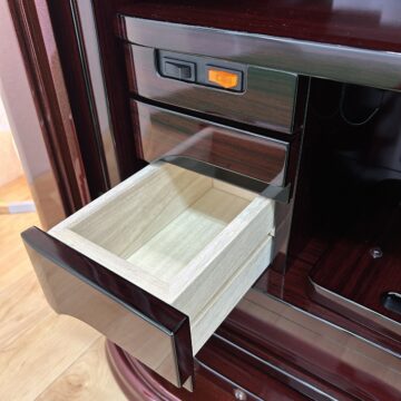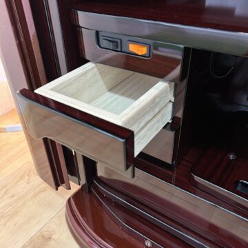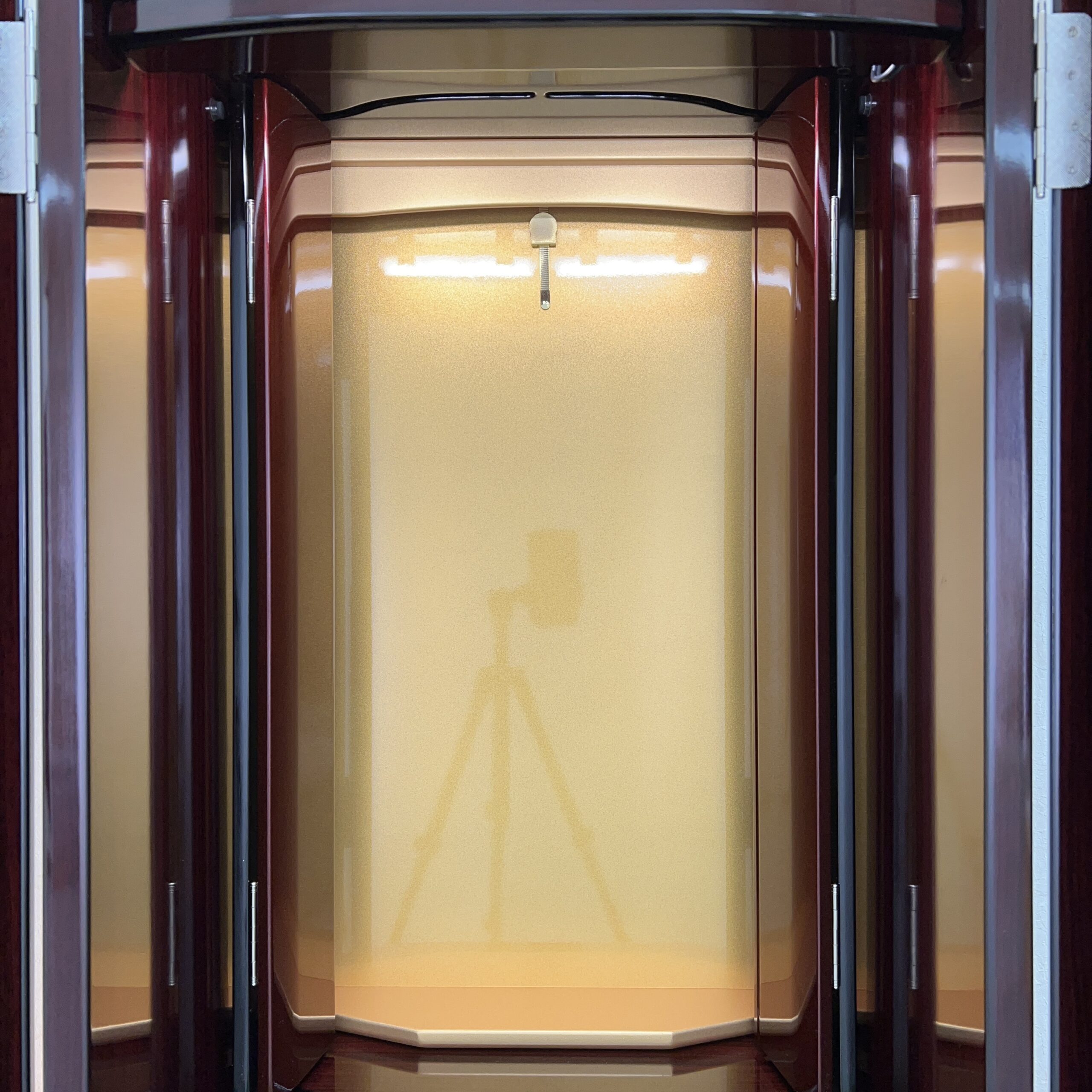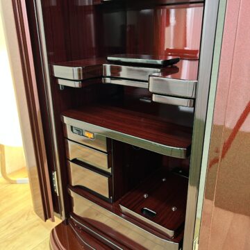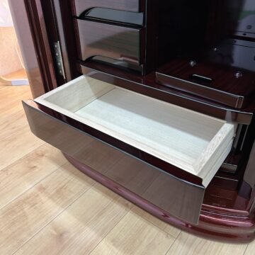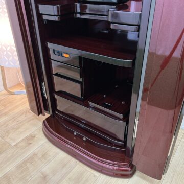 極上の美しさ「ワインレッド・メタリック仕上げ」 幾重にも塗り重ねられた多層塗りの光沢が、鏡のような透明感を生み出しています。角のないラウンドデザインが、重厚感の中にモダンな軽やかさをプラス。洋室・和室を問わず、どんなインテリアにも美しく調和します。