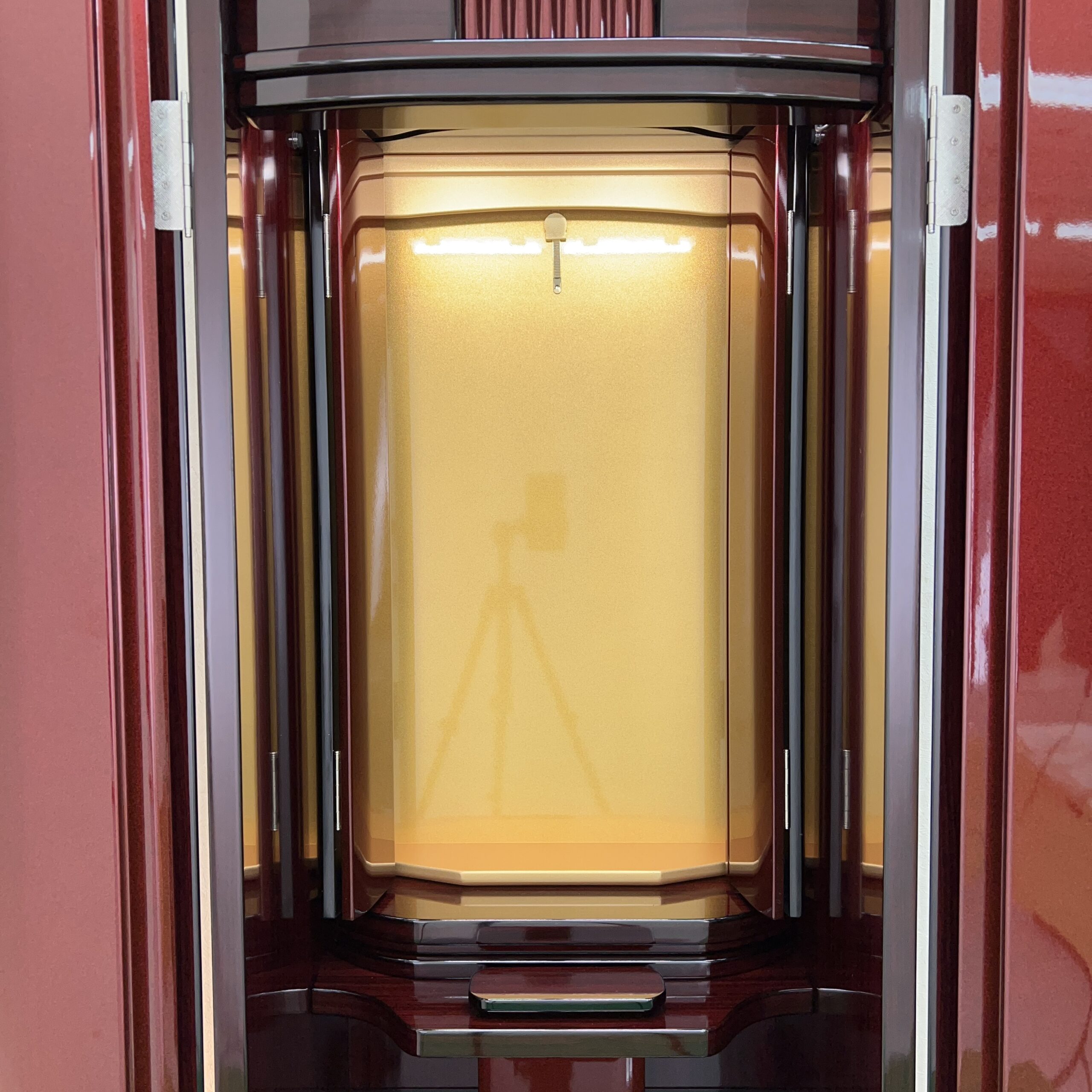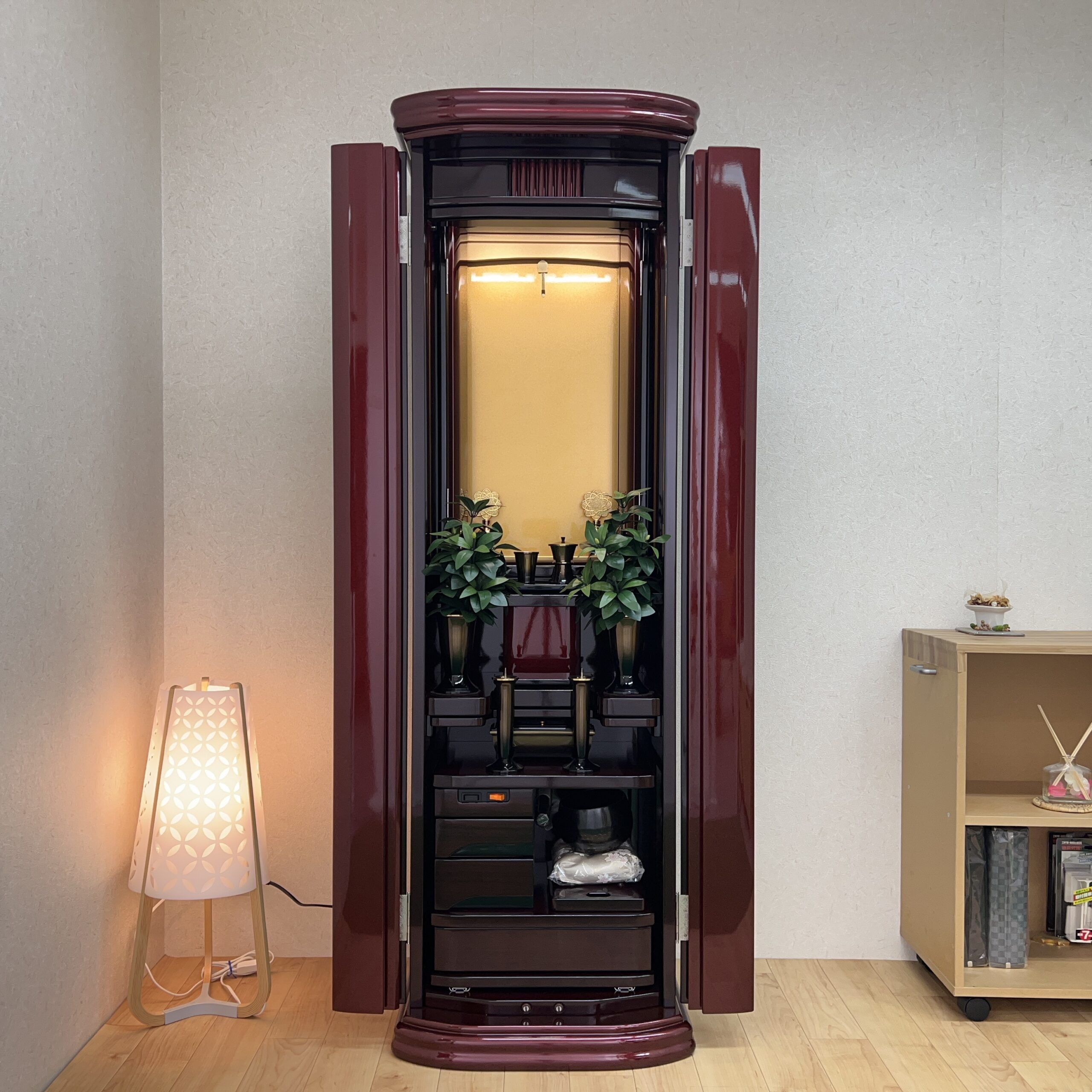 伝統とモダンが融合した、唯一無二の存在感。 お部屋に置いたその瞬間から、空間を華やかかつ荘厳に演出する、最高級仕上げの家具調仏壇です。深みのあるワインレッドのメタリック塗装は、光を優しく反射し、日々の勤行・唱題にさらなる歓びを添えてくれます。